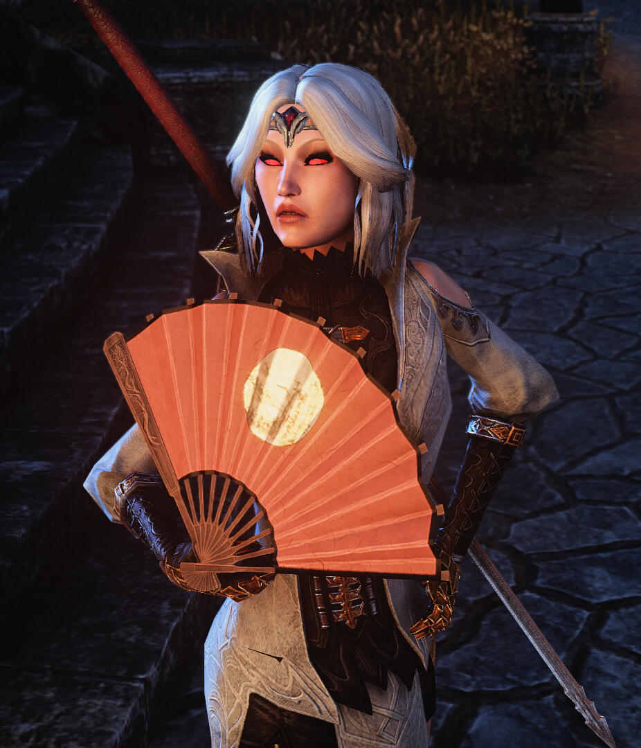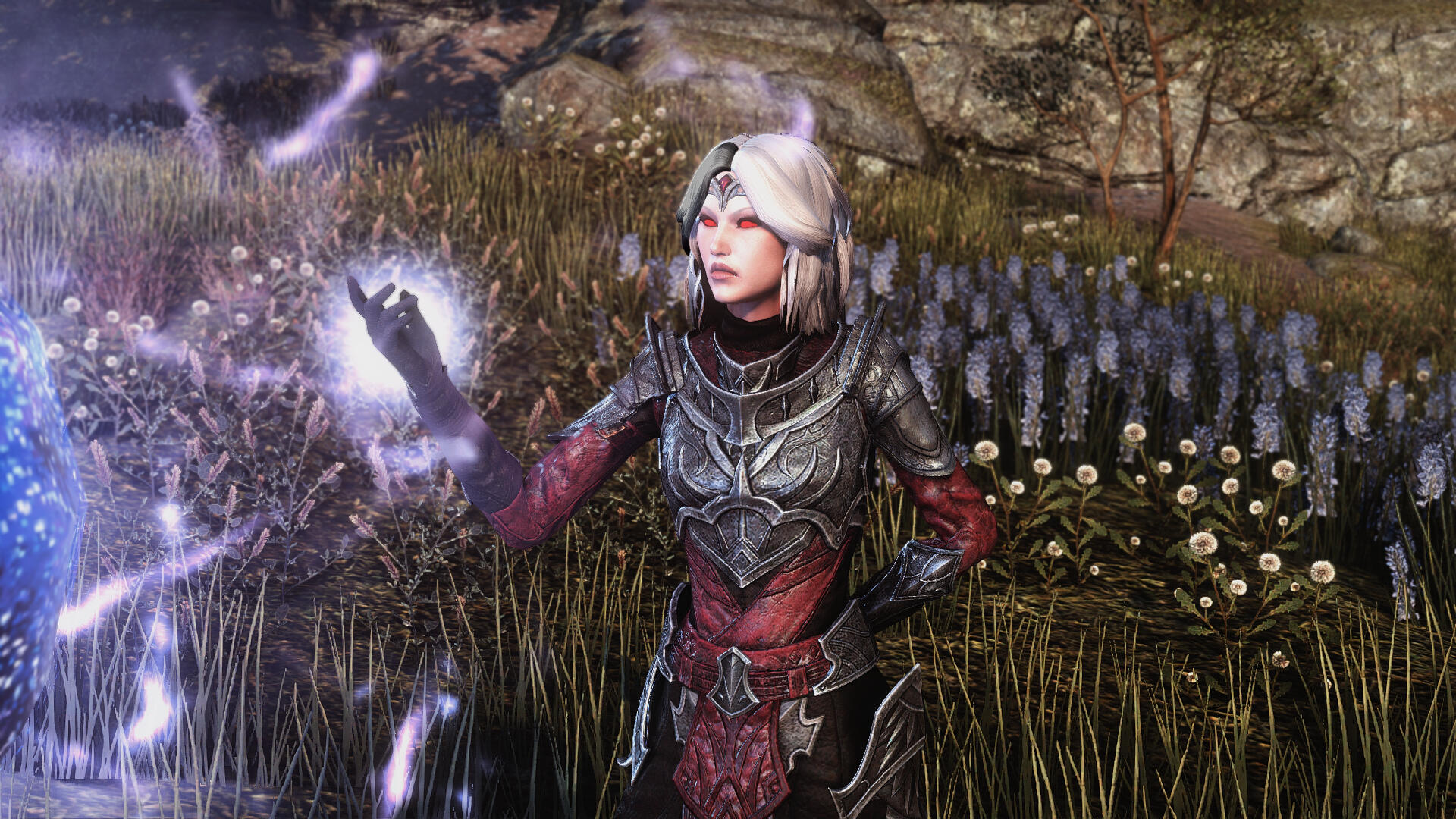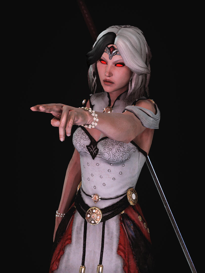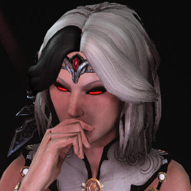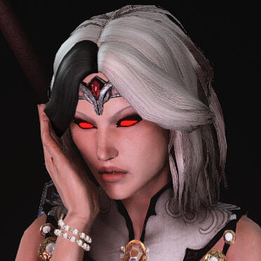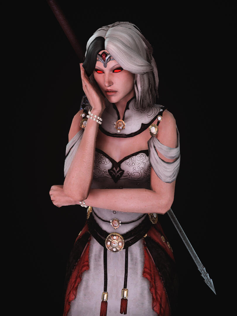 A fierce but sophisticated Breton woman with stark white and black hair and fair skin, a daughter of Northpoint, a skilled duelist and blood magician, and an intelligence asset by trade.The immense amount of time on Alexia's hands has afforded her the opportunity to visit much of Tamriel. She endeavors to destroy daedra, vampires, and witches wherever they prey upon mortals, and gather intel on behalf of the Daggerfall Covenant.