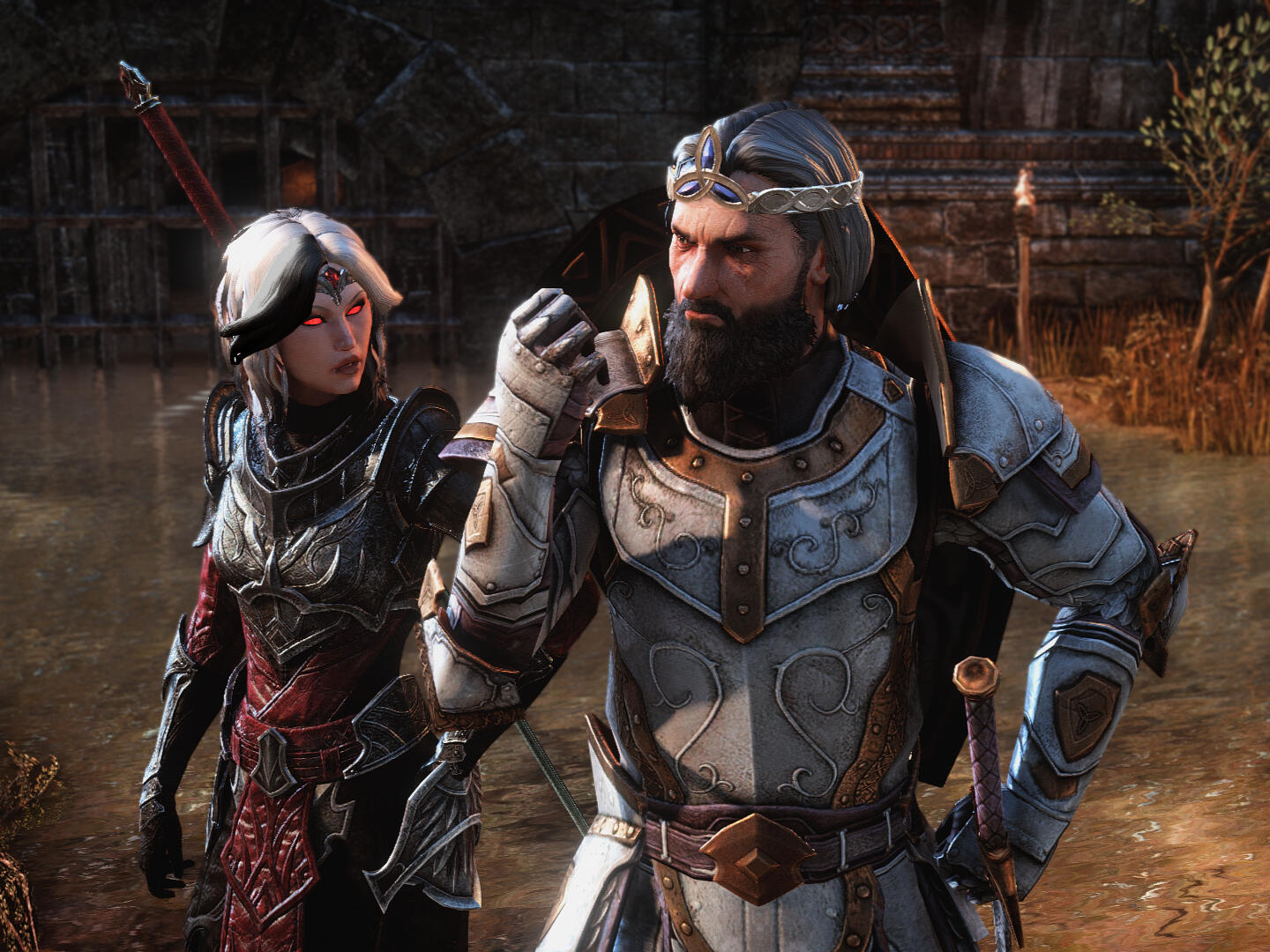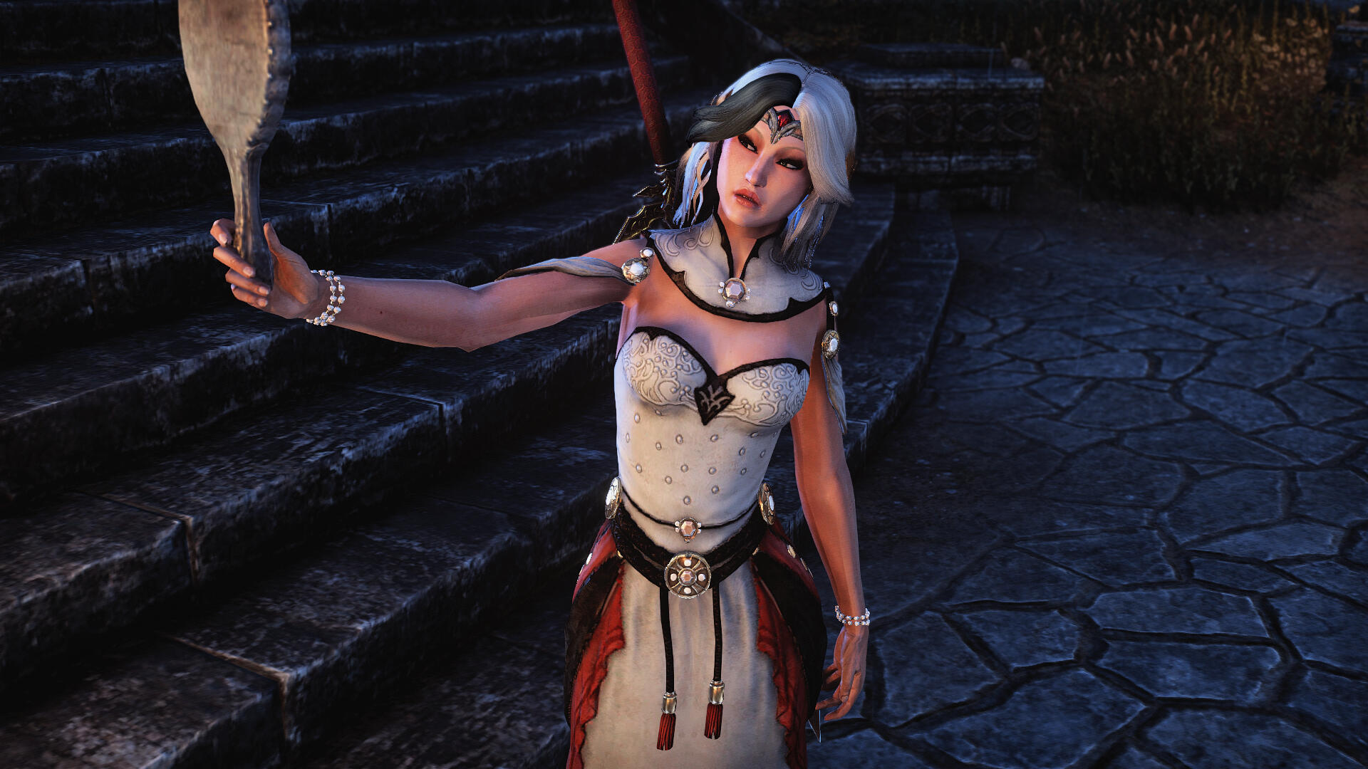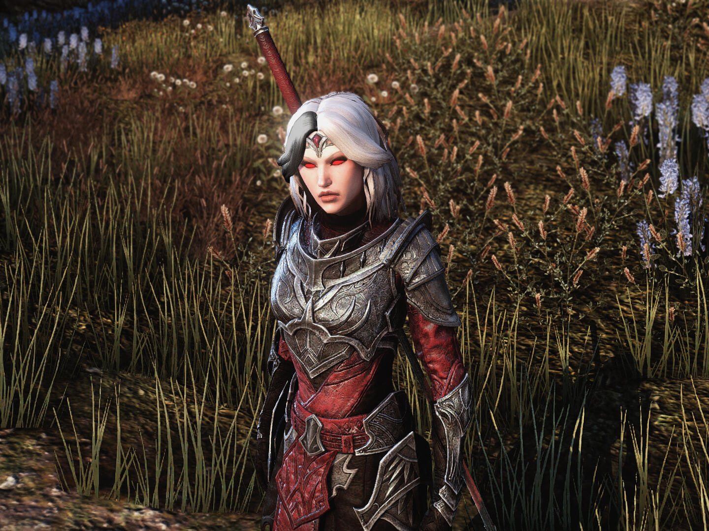 A fierce but sophisticated Breton woman with stark white and black hair and fair skin, a daughter of Northpoint, a skilled duelist and blood magician, and an intelligence asset by trade.The immense amount of time on Alexia's hands has afforded her the opportunity to visit much of Tamriel. She endeavors to destroy daedra, vampires, and witches wherever they prey upon mortals, and gather intel on behalf of the Daggerfall Covenant.