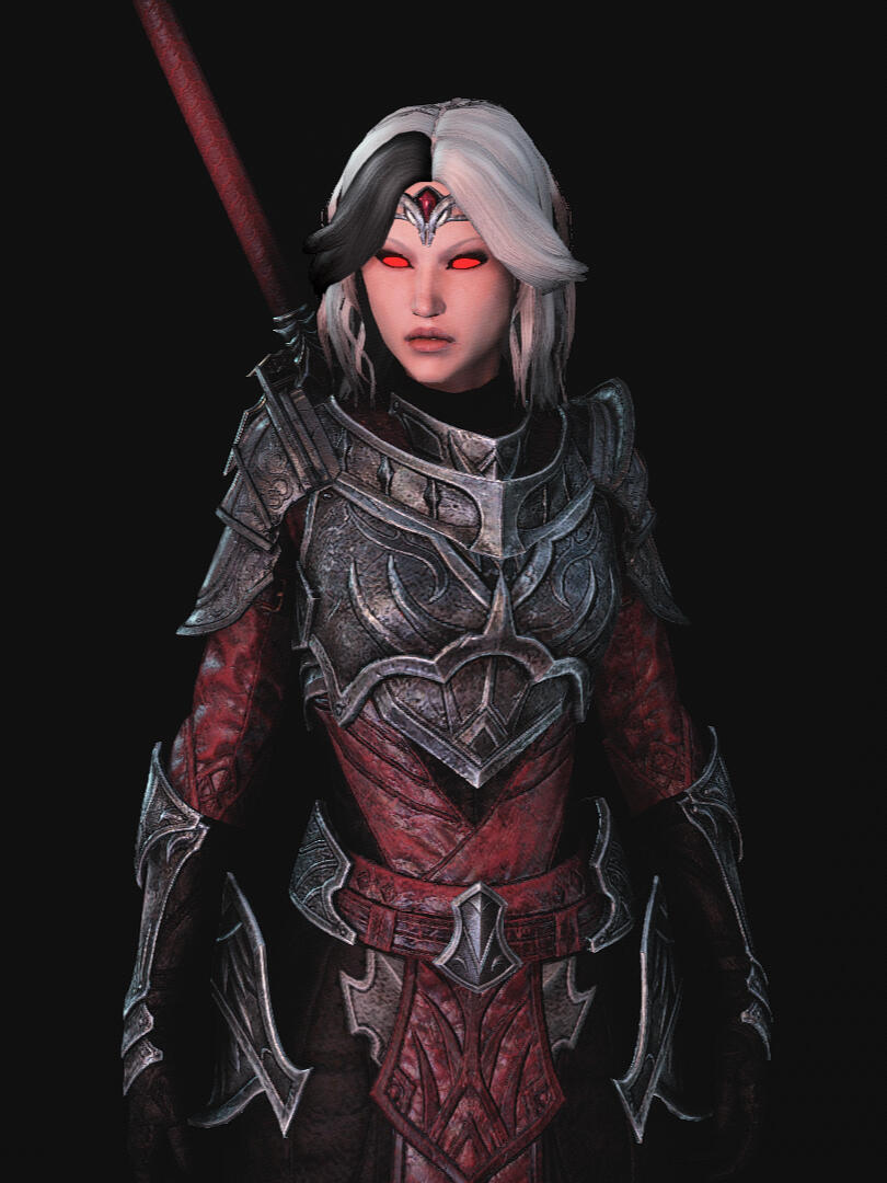 Alexia was born to the Vautri family, a family of carpenters, in the city of Northpoint on one particularly chilly Morning Star evening. She was an only child growing up, though when she was a teenager, her parents gave her a little brother. The Vautri family was well known throughout the Dutchy of Northpoint for their patriarch's carpentry business which patched holes in the trade vessels that constantly flow in and out of Northpoint's docks. Their family's wealth grew modestly and Alexia wanted for nothing.In her early teenage years, Alexia studied the fundaments of Magical theory and practical application under her mother, who was a retired battlemage in the Shornhelm Royal Guard. Alexia grew her magical talents throughout her teen years and became quite proficient in the use of Novice and Apprentice Destruction, Restoration, and Alteration spells, and trained her ability to fight with a sword. Alexia was given two options to pursue in her career, either inheriting her father's carpentry business, or joining the Northpoint guard as a battlemage just as her mother did before her, and living a comfortable lifestyle, for one of her class.Alexia chose to become a royal guard under House Dorell's rulership over Northpoint. She worked in the castle, patrolling, working with leadership and occasionally under the Duke himself. A few years passed and she'd become one of the Duke's personal guards that defended him and organized security whenever he made public appearances. Being a high profile target for any nefarious actors, she had to be vigilant at all times. Her vigilance was not enough to save her when a vampire attempted to kill her as part of an assassination attempt against the Duke, though she survived the ordeal when a fellow guardsmen came to her aid while fighting the beast. Alexia was badly wounded and infected by the vampire, and the castle's healers were unable to cure her. She fell into a three-day coma, and awoke in a locked room. The Duke and his guardsmen did not want to kill Alexia, as they viewed her as a friend. She was still seen as a beast, though, and the castle did not trust her. Terrified, Alexia plead for help and plead for her friends and associates to trust her, and the Duke drafted a letter to Count Verandis Ravenwatch for guidance. Verandis arrived in person a few days later to see Alexia.Verandis, being a vampire himself, offered her guidance, but Alexia had become delirious from hunger, not feasting at all since being infected and having been denied all contact with any other human beings, including her worried family. Verandis offered her a bottle of blood he'd brought for the occasion, seeing she had not become violent or feral, a good sign to him. His hopes were to offer Alexia a new home within the Ravenwatch estate, which Alexia chose to do, having no other option. There, she learned to control her urges, grow her power, and found kinship with other vampires. Alexia's allegiances were still with House Dorell and Northpoint, and she longed to see her family and home again, so she departed the Ravenwatch estate, but had made lifelong allies during her stay there. Upon returning home, and with a letter of good health from Verandis, the Dorell Court admitted her back into the guard, but kept a close eye on her, and she took a less public role in the castle, becoming the castle's night watch captain. Her condition was not something she was ashamed of, and she made no efforts to hide her appearance from the public, much to the common folk's dismay.Alexia continued to grow her talents and skills, and found ethical ways to sate her hunger, though she starved herself more often than was healthy for her. House Dorell took notice to Alexia's newfound abilities, and gave her the opportunity to become a spy, saboteur, assassin, and special operations agent on behalf of the House, solving their off-the-books problems. She accepted the offer, and became integral to the House and the Duke. After a year or so of this, she had worked all over Rivenspire, and was offered a role like the one she already had, but on the Rivenspire Regency Council, working with all three of the Noble Houses Dorell, Tamrith, and Montclair. Any enemies of the Council would meet their end at the tip of Alexia's silver greatsword.