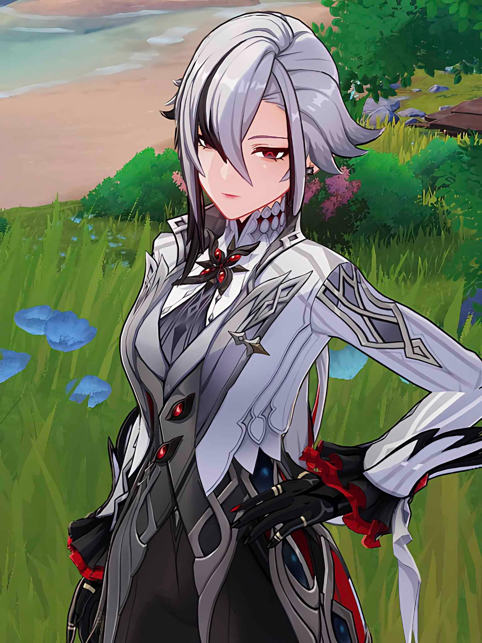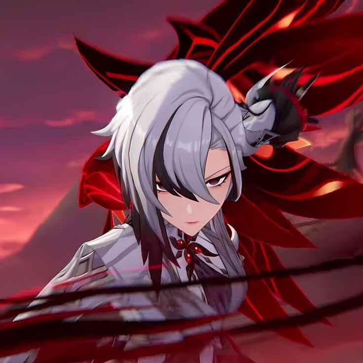 Alexia's color palette is entirely Black / White (& silver) / Red, and this is consistent through her physicality, her armor, her dresses, and her combat abilities.Alexia's hair is symbolic, such that she is mostly good (white or light being motifs of goodness) but has a bit of darkness and evil in her (black as a motif for evil or darkness). It's not much darkness, represented only by one half of her curtain bangs, but it's at the front and center as something prominent within her despite being only a small part